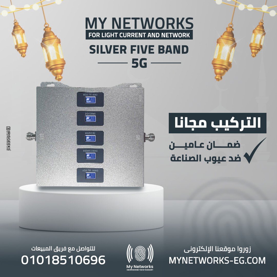 مقوي شبكة 5G Silver Five Band هو الحل الأقوى لمشكلة ضعف الشبكة والإنترنت داخل المنازل والمكاتب. يدعم 5 نطاقات ترددية لضمان أقصى تغطية، اتصال ثابت، وسرعات إنترنت أعلى.